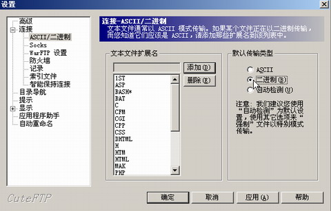 1.如果您采用的是Cuteftp来上传系统,请参照下图进行设置:编辑-设置-传输类型-二进制,如图所示: